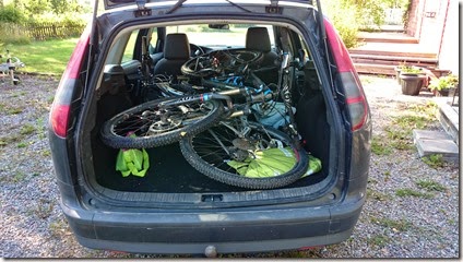 Premiär på mtb för säsongen. Det känns nästan som man glömt hur man gör. Hm just ja, först meka, pumpa dämpare och däck. Sedan in med grejerna i bilen.